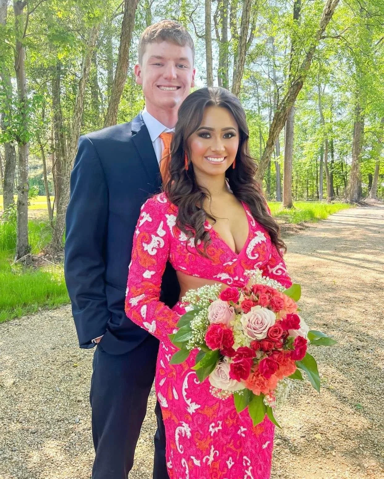 A young couple stands outdoors in a wooded area, smiling for the camera. The woman is dressed in a bright pink and orange patterned dress with a deep neckline and holds a large bouquet of pink, red, and white flowers. The man is dressed in a dark sui