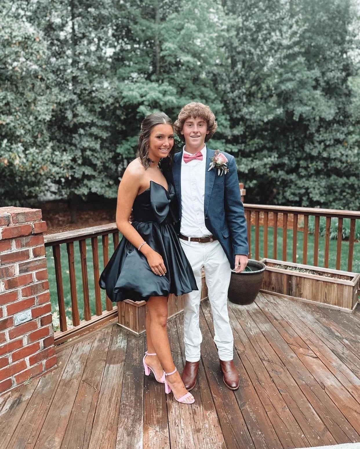 Young woman in a black strapless dress and pink high heels standing with young man in a navy blazer, white pants, and pink bow tie on a wooden deck outdoors.